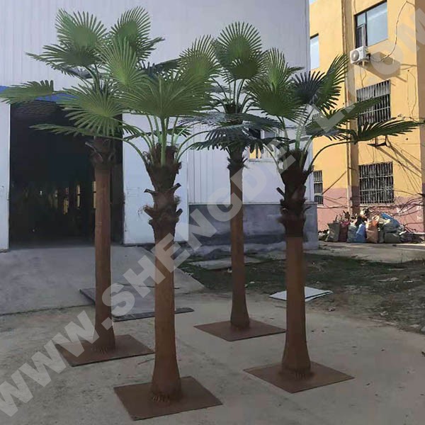 仿真棕櫚樹主要采用璃鋼樹脂樹桿材料結(jié)構(gòu),用高性能環(huán)氧樹脂和玻璃纖維纏繞成型,樹桿內(nèi)采用國標(biāo)鋼結(jié)構(gòu),樹葉采用ABS塑料或PU等高性能防阻燃環(huán)保材料。具有耐腐蝕性能、耐高溫、防阻燃,使用更加環(huán)保。